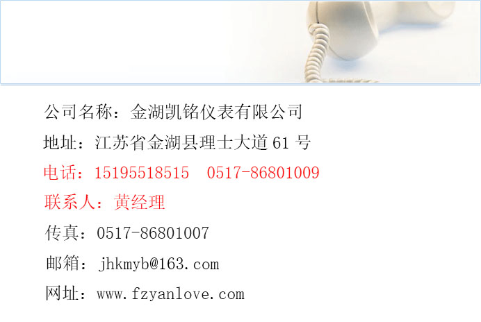金湖凱銘儀表有限公司是一家生產(chǎn)儀器儀表廠家。本公司將以優(yōu)質(zhì)的產(chǎn)品、優(yōu)惠的價格、歡迎新老客戶誠信合作。聯(lián)系電話:15195518515 黃經(jīng)理
