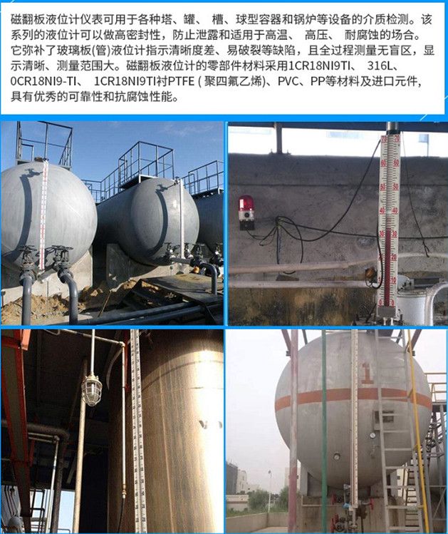 磁翻板液位計(jì)廣泛用于石油、化工、油田、醫(yī)藥、食品、酒業(yè)等行業(yè)中各類貯液罐、貯槽、貯液池、反應(yīng)罐、發(fā)酵罐內(nèi)液體、油田、液化氣、液氫、強(qiáng)酸堿液、弱酸堿液、發(fā)電廠鍋爐汽包、高低加、回水箱高低壓加熱器、凝結(jié)器、蒸發(fā)患有主其他壓力容器內(nèi)與1Cr8NitTi、304+PTEE(聚四氟乙烯)、316L、PVC、PP相容液體介質(zhì)的液位、液面及兩種不同介質(zhì)界面測(cè)量與顯示。