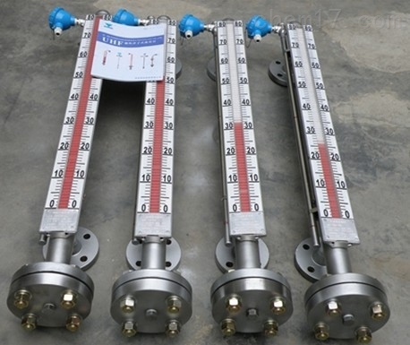 磁翻板液位計測量液體時采用頂裝或旁通管側(cè)裝方式。磁翻柱主體外加裝翻柱液位指示器、液位開關(guān)及液位變送器。磁單元置于浮球內(nèi)部或通過頂桿與浮球相連,當(dāng)浮球連帶磁單 元隨液位變化時,使磁性色塊(磁翻板)翻轉(zhuǎn);磁性液位開關(guān)在對應(yīng)液位點動作;同時液位傳感器在浮球磁力的作用下,輸出標準的變化電阻信號,再經(jīng)過變送器把電阻信號轉(zhuǎn)換 成4~20mA電流信號輸出。