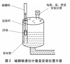 圖2中,B點(diǎn)靠近電機(jī)和泵,耐高溫磁翻板液位計(jì)安裝在此處既影響電機(jī)及泵的檢修,又因泵附近液位的環(huán)流波動(dòng)較大,對(duì)浮子導(dǎo)向管沖刷嚴(yán)重,故B點(diǎn)不合理;C點(diǎn)處因有管道通過,不便維護(hù)且影響管道和泵、電機(jī)等的起吊更換,故也不能選擇C點(diǎn);A點(diǎn)遠(yuǎn)離泵和電機(jī),且有足夠的空間安裝翻板,便于維護(hù),所以A點(diǎn)較為合適。