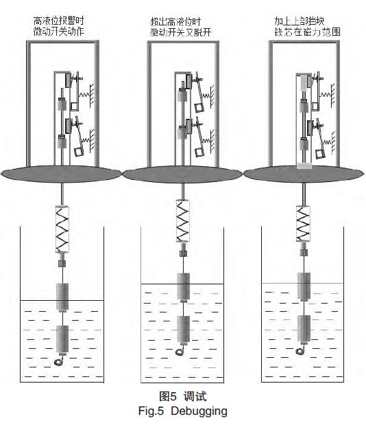 3)在調試過程中,發(fā)現(xiàn)液位開關沒有自保持功能,當高報警點過后,液位再往上升則高液位報警會消除,低液位時也是同樣,在分析原因后發(fā)現(xiàn),鐵芯在套筒內移動的位置不當是造成不能自保持的原因,如圖5所示,于是在套筒內的鐵芯上方加一阻擋塊,使高液位超出時,鐵芯被阻擋塊擋住,不再向上移動,從而不會脫出微動開關的磁力范圍,對低液位報警的自保持是在鐵芯的下部加一個環(huán)型的墊片,阻止鐵芯向下移動超出微動開關的磁力范圍。從而提高了可靠性和重復性。接下來的調試中,又出現(xiàn)了一些零零碎碎的問題,如磁鐵磁性不夠,或者彈簧彈性不夠,彈簧的抗疲勞性差。元器件的材料和加工工藝不理想,出于對核電的安全性和穩(wěn)定性的考慮,開始考慮使用國外公司的產品,在試用后沒有出現(xiàn)以上的問題,于是決定從新采購一批國外的液位開關,將有問題的液位開關更換成國外的產品。