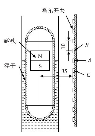 算出磁性浮子的磁場分布,根據(jù)測量精確度、霍爾開關(guān)的磁場強(qiáng)度閡值、霍爾開關(guān)到浮子的距離等己知條件計(jì)算出浮子內(nèi)磁鐵的大小,簡化了工藝流程,減少了工作量。在程序設(shè)計(jì)時(shí),