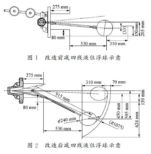針對(duì)減四線液位測量進(jìn)行大轉(zhuǎn)角、切割集油箱改造,有效量程大于設(shè)計(jì)量程的80%,其改造測繪圖如圖2所示。改造后,安裝支架120 mm,插入深度為1?。保担担恚?,實(shí)際測量液位達(dá)450mm,儀表接液部位全部選用317材質(zhì)。轉(zhuǎn)軸—杠桿套筒、杠桿套筒—連桿、浮球—連桿的固定連接節(jié)點(diǎn)及加工焊接坡口增加焊接強(qiáng)度;對(duì)于活動(dòng)節(jié)點(diǎn),采用專用銷子固定。