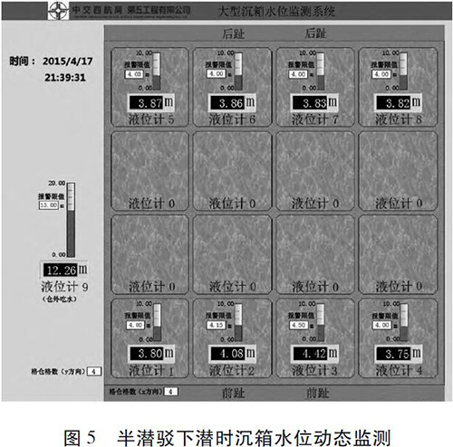 漳州后石港區(qū)3 號(hào)泊位碼頭工程采用重力式沉箱結(jié)構(gòu),該工程沉箱共15 件,單件質(zhì)量4 365 t,沉箱長、寬、高分別為19. 8、21. 9 、25. 0 m; 沉箱分7 層澆筑,澆筑*頂層時(shí)3# 格倉按設(shè)計(jì)圖紙預(yù)留3 m 高的缺口。在漳州預(yù)制廠預(yù)制,沉箱安裝施工現(xiàn)場(chǎng)距離預(yù)制廠約6. 3 km。沉箱采用氣囊橫移至出運(yùn)通道,再縱移至出運(yùn)碼頭前沿線上駁,采用8 000 t 半潛駁下潛安裝。根據(jù)浮游穩(wěn)定計(jì)算,沉箱各格倉壓載水見圖4。2#、6# 格倉為3. 98 m,3#、7#格倉為4. 34 m,其余格倉為3. 80 m,沉箱倉外吃水12. 15 m。根據(jù)當(dāng)?shù)厮恼境毕恚?015-04-17T20∶30 下潛坑潮位條件符合下潛要求,半潛駁在下潛區(qū)開始加水下潛; 下潛至沉箱吃水1. 8 m 時(shí),同時(shí)開啟沉箱的8 個(gè)注水閥門開始向沉箱格倉中注入壓載水; 當(dāng)沉箱吃水5 m 時(shí)半潛駁暫停下潛,起重船靠近半潛駁,工人將連接起重船吊鉤的鋼絲繩用卡環(huán)固定在沉箱頂部吊環(huán)上。半潛駁繼續(xù)下潛至9 m 時(shí)再暫停下潛,等待吊纜就位。半潛駁繼續(xù)下潛,在沉箱底與枕木支墊處于脫離的臨界狀態(tài)時(shí),減緩半潛駁下潛速度,直至沉箱完全脫離浮船塢。此時(shí)啟動(dòng)吊機(jī),使鋼絲繩處于輕微受力狀態(tài)。在半潛駁下潛及沉箱格倉注入壓載水過程中,通過大型沉箱水位監(jiān)測(cè)系統(tǒng)能夠動(dòng)態(tài)顯示各格倉水位值及沉箱的吃水深度( 圖5)