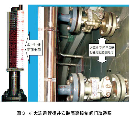 自2009年以來,公司先后對水位計進(jìn)行了5次改進(jìn):安裝磁鐵吸附雜質(zhì)、擴(kuò)大連通管徑并安裝隔離控制閥門、擴(kuò)大穩(wěn)定缸容積、實行雙水位計并聯(lián)讀數(shù)及安裝沖洗閥門,改進(jìn)前如圖1所示。