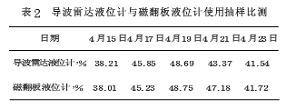 另外,2012年新建20萬t/a合成氨系統(tǒng)2000m³液氨球罐上安裝有一臺(tái)LD51纜式導(dǎo)波雷達(dá)液位計(jì)(位號(hào):LT1201A)和一臺(tái)磁翻板液位計(jì),該信號(hào)均引入DCS顯示。在開始安裝調(diào)試過程中發(fā)現(xiàn)雷達(dá)液位計(jì)與磁翻板液位計(jì)顯示不一致,經(jīng)檢查發(fā)現(xiàn)導(dǎo)波雷達(dá)液位計(jì)取樣管原始高度不正確,經(jīng)重新調(diào)整并對(duì)其相關(guān)參數(shù)進(jìn)行設(shè)定后測(cè)量顯示一致。長期穩(wěn)定運(yùn)行,給工藝控制提供了準(zhǔn)確數(shù)據(jù),滿足了工藝要求,有效地保障了設(shè)備和人身安全。2014年4月儀表人員抽樣比測(cè)記錄數(shù)據(jù),見表2所示。