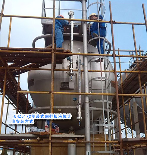 如上圖所示,如果量程為10米,分為兩段錯位安裝,下面一臺的刻度板顯示為0-5米,上面一臺液位計的翻板刻度顯示為5米至10米,下面一臺的5米與上面一臺的5米刻度應(yīng)該是在同一水平面的水平線上(就是上面一臺的下端法蘭中心與下面一臺的上端法蘭中心是要在同一個水平面上)