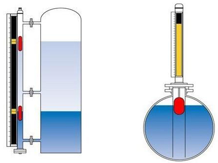 液位計(jì)根據(jù)浮力原理,浮子在測量管內(nèi)隨液位的升降而上下移動,浮子內(nèi)的永久磁鋼通過磁耦合作用,驅(qū)動紅、白色翻柱翻轉(zhuǎn)180’液位上升時,翻柱由白色轉(zhuǎn)為紅色,下降時,翻柱由紅色轉(zhuǎn)為白色,從而實(shí)現(xiàn)液位的指示。