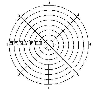 1.2.2 幾何測量法根據(jù)立式金屬罐容量試行檢定規(guī)程,把圓錐體底圓分成M 個(gè)同心圓,根據(jù)所分圓環(huán)面積相等條件決定半徑。圓錐體分為一個(gè)小圓錐和多個(gè)圓臺(tái)。在每個(gè)圓心圓周測N 個(gè)點(diǎn),即測N 個(gè)點(diǎn)到罐底中心的高度。底量測量原理見圖2。