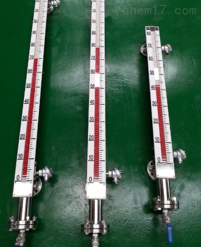 液位計(jì)根據(jù)浮力原理,浮子在測(cè)量管內(nèi)隨液位的升降而上下移動(dòng),浮子內(nèi)的永久磁鋼通過磁耦合作用,驅(qū)動(dòng)紅、白色翻柱翻轉(zhuǎn)180’液位上升時(shí),翻柱由白色轉(zhuǎn)為紅色,下降時(shí),翻柱由紅色轉(zhuǎn)為白色,從而實(shí)現(xiàn)液位的指示。