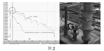 圖5為鈷礦漿化槽液位達到2.3m(量程3m)時回波包絡線圖。該液位計在投產初期一直正常使用,但經過1個月后,液位發(fā)生異常波動的情況越來越頻繁,分析回波曲線后,發(fā)現(xiàn)在較低的液位(2.3m)時,回波強度也比較弱(30dB)。拆下液位計檢查后發(fā)現(xiàn)液位計表面附著了一層黑色的礦漿,導致液位計無法正常工作。
