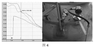 圖4為鹽酸配置槽正在加稀釋水且液位達到2.7m(量程3m)時回波包絡線圖。此時,測量值跳動明顯。分析原因:雷達液位計無明顯回波信號,且回波信號波動較大。該液位計在中低液位計加料時,測量值準確、穩(wěn)定,但高液位加稀釋水時,加料口距離雷達液位計距離過近,飛濺起的水花對回波產生了較大的干擾,從而影響了測量。