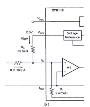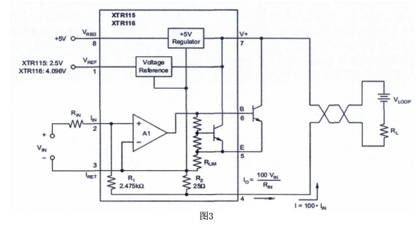 把傳感器輸出的不同電壓轉(zhuǎn)換成標(biāo)準(zhǔn)的4-20ma輸出,可采用不同的電路形式。成本低的可采用分立器件,但是為了達(dá)到比較高的精度,要保證相應(yīng)器件的匹配程度,調(diào)試也比較麻煩。TI公司推出的XTR 系列工業(yè)傳感器專用的4-20ma的一體化變送器集成電路,采用該系列產(chǎn)品設(shè)計(jì)的變送器成本低,精度高,調(diào)試簡(jiǎn)單。經(jīng)過(guò)選擇決定使用XTR115完成設(shè)計(jì)。內(nèi)部結(jié)構(gòu)如圖三: