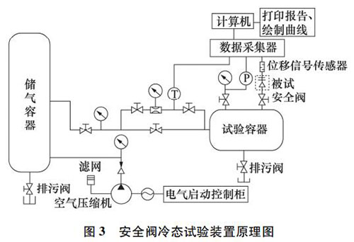 安全閥冷態(tài)試驗(yàn)裝置( 見圖 3) 主要由壓縮氣源、儲(chǔ)氣罐、節(jié)流控制閥、試驗(yàn)罐、閥門和管道、數(shù)據(jù)采集系統(tǒng)、控制系統(tǒng)等組成,可對(duì)公稱壓力 PN≤20 MPa,公稱通徑 DN≤150 mm 的安全閥進(jìn)行整定壓力試驗(yàn)、排放壓力試驗(yàn)、回座壓力試驗(yàn)、開啟高度試驗(yàn)、排量及排量系數(shù)試驗(yàn),檢測(cè)參數(shù)和自動(dòng)化程度達(dá)到國(guó)內(nèi)**水平。