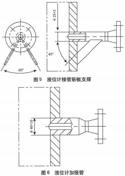 圖5是泄漏襯四氟磁翻板液位計(jì)接管結(jié)構(gòu),雖然必25mmx35mm接管的開孔補(bǔ)強(qiáng)滿足GB150-1989標(biāo)準(zhǔn)[11“開孔不另行補(bǔ)強(qiáng)”的要求,但卻不符合現(xiàn)行標(biāo)準(zhǔn)GB/T150-2011的“開孔不另行補(bǔ)強(qiáng)”要求。因?yàn)?,兩?biāo)準(zhǔn)雖然限制的設(shè)計(jì)壓力(<2.5MPa)與接管外徑(<89mm)等條件相同,但是后者改版標(biāo)準(zhǔn)卻對(duì)接管壁厚及腐蝕裕量增加了要求,這是合理的改進(jìn)完善。對(duì)于本例的425mm接管,滿足GB/T150-2011的“開孔不另行補(bǔ)強(qiáng)”條件的管壁厚度至少應(yīng)為5.5mm(按標(biāo)準(zhǔn)規(guī)定當(dāng)腐蝕裕量為1mm時(shí),接管厚度應(yīng)不小于3.5mm)。所以,按HG/T20583-2011對(duì)小接管避免彎曲而推薦的加強(qiáng)結(jié)構(gòu)優(yōu)先選用加強(qiáng)管形式建議將液位計(jì)接管更改為圖6的加強(qiáng)管結(jié)構(gòu)。這樣不但解決了小接管的開孔補(bǔ)強(qiáng)和防彎曲加強(qiáng)問題,也可以使小接管的設(shè)計(jì)使用年限與罐體一致,而且便于保證小接管與罐體采用插人式全焊透角焊縫的焊接質(zhì)量。