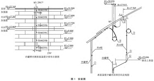 以昆侖能源華油天然氣四川廣安液化天然氣2萬方儲罐為例,在安裝多點(diǎn)溫度計(jì)過程中,內(nèi)罐底部溫度熱電阻需要從內(nèi)罐浮頂進(jìn)入罐內(nèi),沿罐壁垂直向下固定在罐底部。如需夾層底部溫度測量,則需要將溫度熱電阻沿外罐壁垂直而下,固定在罐底夾層的氮?dú)夤苌?,每間隔4m布置1個(gè)電纜固線器,如圖1所示。