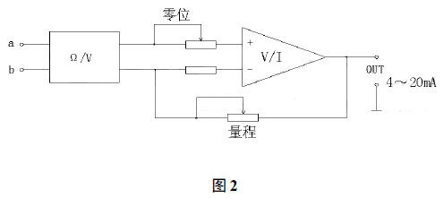 來自液位傳感器的對應液位高度的電阻信號,進入圖2所示的a,b端,經(jīng)處理后*終輸出4~20mA DC標準信號。