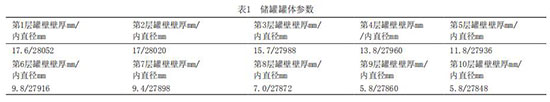 (1)改造前對儲罐的罐體進行了超聲波測厚以及材料的化學成分及性能分析,其材質滿足現(xiàn)行的使用條件,其儲罐的罐體參數(shù)及每層罐壁的厚度(實測)見表1,罐壁的每層壁板高度為1690mm,其搭接寬度為40mm,縱焊縫為對接結構,見表1。