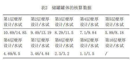 根據(jù)GB50341-2014《立式圓筒形鋼制焊接油罐設計規(guī)范》中的規(guī)定,儲罐內徑小于60m,采取的是定設計點發(fā)進行核算[3],核算出的儲罐的每層罐壁的所需厚度(mm)(設計與試水條件下)見表2。