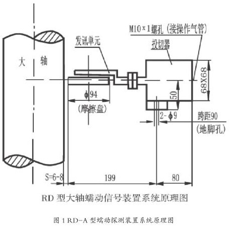 該電站蠕動(dòng)探測(cè)之前主要使用的是氣動(dòng)式機(jī)械蠕動(dòng)裝置和電動(dòng)式機(jī)械蠕動(dòng)裝置,哈電機(jī)組和 VHS 機(jī)組使用的是氣動(dòng)式蠕動(dòng)裝置,型號(hào)為 RD-A 哈控,RD-A 型蠕動(dòng)探測(cè)裝置由投切器和發(fā)訊單元兩部分組成,當(dāng)機(jī)組停機(jī)完成后通過蠕動(dòng)控制電磁閥(空氣電磁閥)向投切器通入壓縮空氣,它將發(fā)訊單元向前推進(jìn),使其磨擦盤與機(jī)組大軸表面相接觸(有稍許正壓力)。如果大軸發(fā)生蠕動(dòng),轉(zhuǎn)角達(dá)到 1.5° ~2°時(shí),發(fā)訊單元便發(fā)出大軸蠕動(dòng)信號(hào),作用于報(bào)警與制動(dòng)回路,投入制動(dòng)閘以防蠕動(dòng)現(xiàn)象擴(kuò)延。機(jī)組起動(dòng)前,先動(dòng)作空氣電磁閥使投切器排氣,由于彈簧力的作用,發(fā)訊單元退回原位。離開大軸表面 6 mm~8 mm,確保裝置安全。RD-A型蠕動(dòng)探測(cè)裝置系統(tǒng)原理如圖1所示。RD-A型探測(cè)裝置易卡澀導(dǎo)致探測(cè)裝置投退失敗,影響開停機(jī)成功率。東電機(jī)組使用的是電動(dòng)式蠕動(dòng)裝置,型號(hào)為 PXJ-1D。PXJ-1D 型蠕動(dòng)探測(cè)裝置多起反饋信號(hào)拒動(dòng)的事件,導(dǎo)致開停機(jī)流程退出,其原因?yàn)殡妱?dòng)式蠕動(dòng)裝置控制回路與位置反饋節(jié)點(diǎn)取自同一個(gè)行程開關(guān),當(dāng)行程開關(guān)常閉節(jié)點(diǎn)斷開時(shí),電機(jī)停止轉(zhuǎn)動(dòng),而此時(shí)可能因行程過短導(dǎo)致常開節(jié)點(diǎn)尚未閉合,位置信號(hào)無法正常上送至監(jiān)控系統(tǒng)。為了解決這一問題,目前電站 15 臺(tái)機(jī)組蠕動(dòng)探測(cè)裝置已換型為非接觸式蠕動(dòng)探測(cè)裝置,避免開停機(jī)過程中投入或退出蠕動(dòng)失敗導(dǎo)致的流程退出。非接觸式蠕動(dòng)探測(cè)裝置設(shè)計(jì)原理為 :