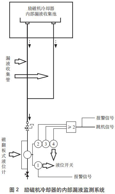 實(shí)際運(yùn)行經(jīng)驗(yàn)表明,球罐液位計(jì)內(nèi)部銅管發(fā)生泄漏的概率較低,但一旦發(fā)生泄漏,漏液會(huì)隨著冷卻空氣沿閉合風(fēng)路進(jìn)入勵(lì)磁機(jī)內(nèi)部,造成勵(lì)磁機(jī)短路損壞的嚴(yán)重后果。為了保證機(jī)組安全,應(yīng)有冷卻器內(nèi)部銅管泄漏監(jiān)測(cè)裝置,然而現(xiàn)場(chǎng)沒(méi)有配置此類(lèi)裝置。