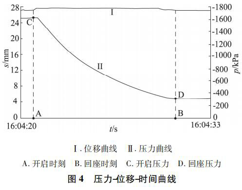 運(yùn)用安全閥冷態(tài)試驗(yàn)裝置對(duì)該苯酚液位計(jì)進(jìn)行動(dòng)作性能試驗(yàn),將試驗(yàn)容器內(nèi)的介質(zhì)壓力卸放到整定壓力以下,開(kāi)啟試驗(yàn)容器和安全閥進(jìn)口端的球閥,關(guān)閉流量計(jì)管路閥門,開(kāi)啟主測(cè)試管路截止閥,開(kāi)啟儲(chǔ)氣容器通向試驗(yàn)容器的節(jié)流閥,逐漸加壓,同時(shí)啟動(dòng)計(jì)算機(jī)數(shù)據(jù)采集系統(tǒng),被試安全閥開(kāi)啟,繼續(xù)升高壓力,直至被試安全閥保持全開(kāi)啟( 排放) 狀態(tài),然后關(guān)閉儲(chǔ)氣容器通向試驗(yàn)容器的閥門,被試安全閥亦逐漸關(guān)閉。計(jì)算機(jī)自動(dòng)生成試驗(yàn)過(guò)程的壓力、位移曲線,試驗(yàn)人員記錄采集開(kāi)啟壓力、排放壓力、回座壓力、開(kāi)啟高度等數(shù)據(jù)。重復(fù)上述試驗(yàn)至少 3 次,得到相應(yīng)壓力-位移-時(shí)間曲線,見(jiàn)圖 4。左縱坐標(biāo)為位置,右縱坐標(biāo)為壓力,其中上部曲線代表導(dǎo)閥位移,下部曲線代表壓力變化。當(dāng)導(dǎo)閥位置發(fā)生變化,代表導(dǎo)閥開(kāi)始開(kāi)啟動(dòng)作,此時(shí)的壓力為該苯酚液位計(jì)的開(kāi)啟壓力,即整定壓力; 當(dāng)導(dǎo)閥位置回到原點(diǎn)代表導(dǎo)閥已經(jīng)回座,此時(shí)對(duì)應(yīng)的壓力即為回座壓力。