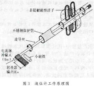 其工作原理是利用磁場脈沖波,測量時(shí)液位計(jì)的頭部發(fā)出電流“詢問脈沖”,此脈沖同時(shí)產(chǎn)生磁場,沿波導(dǎo)管內(nèi)的感應(yīng)線向下運(yùn)行,在液位計(jì)管外配有浮子,浮子可隨液位沿側(cè)桿上下移動,浮子內(nèi)設(shè)有一組永久磁鐵,其磁場與脈沖產(chǎn)生的磁場相遇則產(chǎn)生一個(gè)新的變化磁場,隨之產(chǎn)生新的電磁“返回脈沖”,測定“詢問脈沖”和“返回脈沖”的周期便可知道液位的變化。因此,磁致式液位計(jì)是以浮子為測量元件通過磁耦合的變化傳遞到指示器,使指示器能夠清晰地指示出液位的高度。