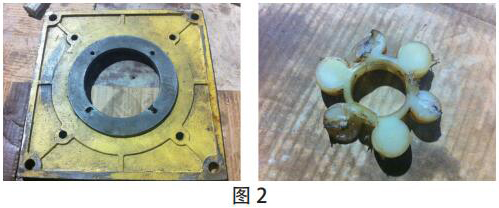 2015 年 9 月 23 日運行過程中,02:15 因“機組高位油箱低油位動作”停機。現(xiàn)場拆解稀油站 1# 低壓油泵,發(fā)現(xiàn)油泵與底座 2 顆連接螺栓脫落、出油管松脫、底座螺孔拉崩、螺孔周圍多處裂紋、緩沖墊破損等諸多問題。造成油泵無法供油,引起停機。如圖 2 所示。