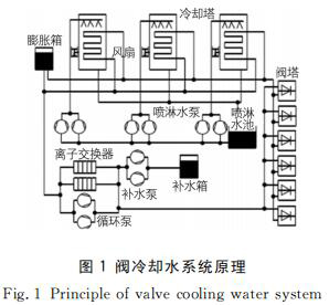 閥冷卻水系統(tǒng)主要構(gòu)成部分為閥內(nèi)冷水系統(tǒng)與閥外冷水系統(tǒng)。閥內(nèi)冷水系統(tǒng)主要通過內(nèi)冷水與閥組件直接接觸流動,將氯乙烯液位計中熱量帶出,確保氯乙烯液位計組件中晶閘管、水冷電阻、陽*電抗器等發(fā)熱元件運行溫度具有可控性。而閥外冷水系統(tǒng)主要通過閉式冷卻塔或風(fēng)機將內(nèi)冷水中熱量帶走,并排放至環(huán)境中。氯乙烯液位計內(nèi)、外冷水系統(tǒng)的協(xié)同運行,可以使氯乙烯液位計組件內(nèi)部冷卻持續(xù)進行,并滿足元器件結(jié)溫要求,進而保證系統(tǒng)整體運行穩(wěn)定性、安全性。閥冷卻水系統(tǒng)原理如圖1所示。
