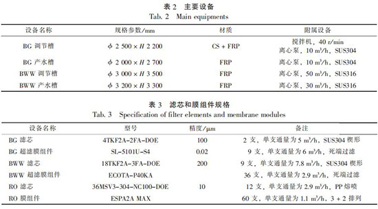 超濾膜組件和反滲透膜組件前均設置保安過濾器, 濾芯和膜組件規(guī)格參數(shù)見表 3。