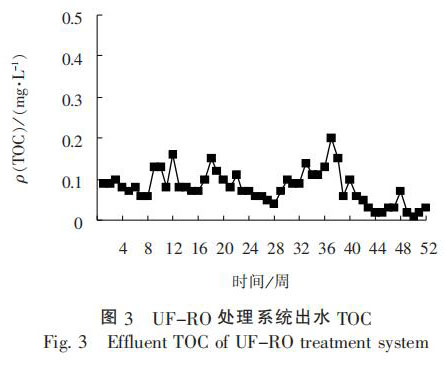 經過 1 年的連續(xù)運行, 晶背研磨廢水進水 TOC質量濃度為 0.5 ~ 5.0 mg / L, 濁度為 80 ~ 100 NTU,SiO2 質 量 濃 度 為 2 ~ 4 mg / L, 反 洗 廢 水 進 水 TOC質 量 濃 度 為 1.5 ~ 3.0 mg / L, 濁 度 為 4 ~ 8 NTU,UF-RO 處理出水 TOC 質量濃度低于 1 mg / L, 濁度低于 0.1 mg / L, SiO2 質 量 濃 度 低 于 1 mg / L, 完 全可以回用至超純水預處理系統(tǒng)。 UF-RO 處理系統(tǒng)出水電導率和 TOC 濃度見圖 2 ~ 圖 3。
