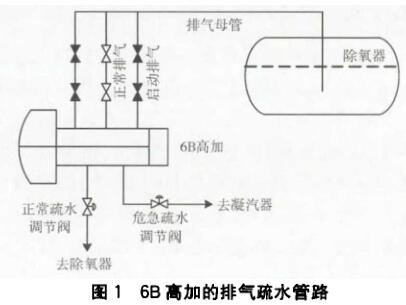 6B高壓加熱器設(shè)有2路啟動排氣和1路正常排氣,3路排氣管道匯至1根管道進(jìn)人除氧器并插人除氧器正常液面以下,如圖1所示。啟動階段高壓加熱器啟動排氣閥門和正常排氣閥門均開啟排氣,正常運(yùn)行時啟動排氣閥關(guān)閉,正常排氣閥開啟。排氣管線從7.5 m平臺經(jīng)過多次折向匯集到23 m排氣母管,然后再引人除氧器,這導(dǎo)致排氣管線存有蒸汽冷凝水;由于在排氣管線上存有一定的冷凝水,啟動排氣閥開啟后,存在于排氣管道的冷凝水依靠重力排至高壓加熱器汽側(cè),在啟動排氣管至除氧器的管路中形成一定的真空,從而產(chǎn)生虹吸作用,使除氧器的水吸人6B高壓加熱器,導(dǎo)致B側(cè)高壓加熱器液位異常升高而發(fā)生解列。
