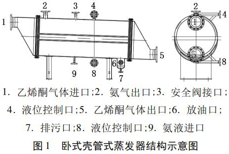 廣西某化工實業(yè)有限公司購進了四臺靖江容器制造有限公司生產(chǎn)的換熱面積為 26. 3 m3 的臥式殼管式蒸發(fā)器,廠家提供的結(jié)構示意圖見圖 1,主要用于冷卻乙烯酮氣體,要求四臺臥式殼管式蒸發(fā)器出口的乙烯酮氣體溫度依次為 - 5℃、- 10℃、- 15℃、 - 20℃,以分離出乙烯酮氣體中的水和醋酸,并防止結(jié)冰。