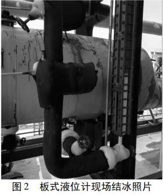 制冷系統(tǒng)調(diào)試運行時,發(fā)現(xiàn)防霜磁翻板液位計的底部開始有氨氣泡形成,徐徐上升到液面消失,并且液面上下浮動,幅度較大,不能穩(wěn)定在某一位置內(nèi)。隨著系統(tǒng)的運行,液位計的下部開始結(jié)露、結(jié)霜,結(jié)霜高度逐漸增加,并由霜轉(zhuǎn)化為冰,無法觀察到液位,見圖 2。同時,螺桿式制冷壓縮機出現(xiàn)了“潮車”現(xiàn)象。由于操作者無法判斷液位的準確位置,為防止事故發(fā)生,被迫停機,嚴重影響了物料的生產(chǎn)。
