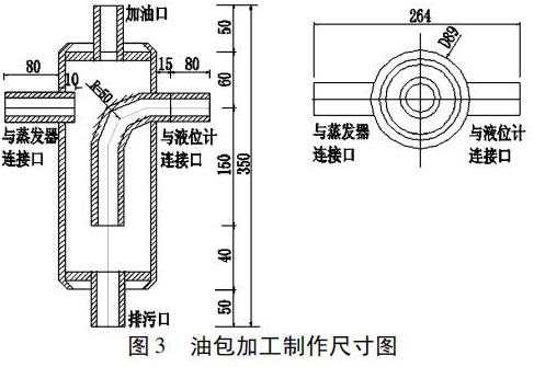 1. 現(xiàn)場加工制作油包。油包式液位計包括油包和防霜磁翻板液位計兩部分,通 過 管 道、閥 門 連 接 而成。油包是油包式液位計的關鍵部件,容積過小或與防霜磁翻板液位計連接不符合要求,有可能造成液位上升、下降緩慢,液位反應不靈敏,或者油包結(jié)霜。圖 3 為油包加工制作尺寸圖,現(xiàn)場加工按圖紙要求制作。
