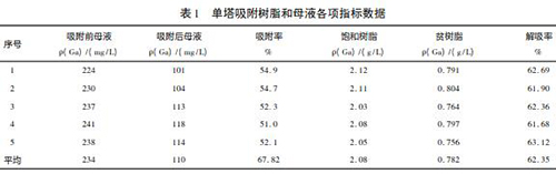 (1) 技改原理: 新樹脂入廠檢驗(yàn),飽和樹脂容量可以達(dá)到 2. 5 ~ 2. 8g /L。但在實(shí)際生產(chǎn)中由于含液位計(jì)母液的通過量不足,造成樹脂的吸附率較低,新樹脂飽和樹脂容量一般在 2. 0 ~ 2. 2g /L 之間。通過再增加一組吸附塔來進(jìn)行雙塔吸附,即提高了樹脂利用率,又充分利用了母液,提高樹脂的飽和度。采用雙塔交叉吸附工藝的升級(jí)改造,是在原有單塔吸附的基礎(chǔ)上增加一個(gè)吸附塔和一臺(tái)母液進(jìn)塔泵。兩臺(tái)母液進(jìn)塔泵分別向兩個(gè)吸附塔同時(shí)供液樹脂吸附飽和后,兩個(gè)吸附塔樹脂交叉進(jìn)行下步解吸工藝。表 1為單塔吸附工藝生產(chǎn)中取用的一組數(shù)。