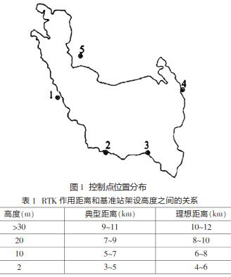 在該水庫工程當中,測量人員采用的坐標系統(tǒng)是1980西安坐標系。在具體的測量過程之中,測量人員運用2臺南方GPS儀器來收集相應的測量數(shù)據(jù),并使用1臺徠卡全站儀、一臺GPS-RTK來完成相應的數(shù)據(jù)采集工作。對水庫進行勘測定界的主要目的是針對淹沒線作用的土地范圍,對界樁實施測量與放樣,結(jié)合設計水位的高程,做好界樁拔放工作。因為該地區(qū)的地形比較陡峭,故測量人員決定采用雙基站方法開展測量工作。該地區(qū)共有5個控制點,具體的位置分布見圖1。另外,因為RTK數(shù)據(jù)鏈使用超高頻電磁波,數(shù)據(jù)鏈所發(fā)生的電磁波頻率比較高,能夠得到456MHz,為了保證測量數(shù)據(jù)更為精確,測量人員可以將基準站設置在測區(qū)的zui高位置,并結(jié)合RTK作用距離和基準站架設高度之間的關(guān)系,合理控制基準站的架設高度,RTK作用距離和基準站架設高度之間的關(guān)系見表1。