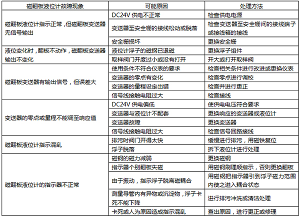 先檢查磁翻板變送器,供電電壓,信號線路是否正常;還應(yīng)檢查干簧管及電阻組件是否出現(xiàn)接觸不良,短路,開路故障;受到其他磁場的干擾會使干簧管誤動作,導(dǎo)致標(biāo)稱電阻值變化而出現(xiàn)液位顯示偏差故障。干簧管粘連不釋放也是常見的故障,只需輕輕敲打測量導(dǎo)管一般都可以消除此故障。
