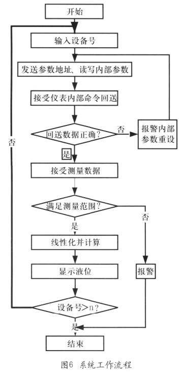 系統(tǒng)工作流程如圖6所示。*先對(duì)容器設(shè)備進(jìn)行基本測(cè)量。輸入容器高度E,滿載高度F及應(yīng)用參數(shù)A(A是用來(lái)將儀表調(diào)到滿足測(cè)量要求的應(yīng)用參數(shù))。這些參數(shù)輸入后,由智能顯示儀表或計(jì)算機(jī)得到的操作矩陣將被鎖定,以保證設(shè)置不受意外情況影響,再對(duì)采集到的數(shù)據(jù)線性化(線性化過(guò)程描述了測(cè)量電平與罐容量或產(chǎn)品重量間的關(guān)系)之后,測(cè)量值將在相應(yīng)部分顯示出來(lái)。