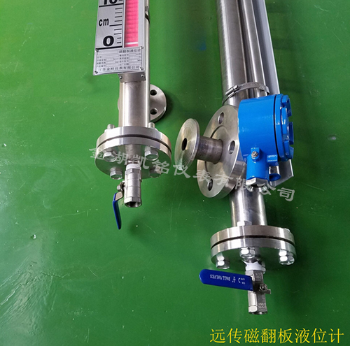 在桶槽外側(cè)裝置延伸旁路管,由旁路管外加裝液位指示器,將裝有磁鐵的浮球放進(jìn)旁路管內(nèi),因磁性色片內(nèi)裝著與浮球磁性相反之磁鐵,所以當(dāng)浮球上升時(shí)會(huì)吸引磁性色片翻動(dòng),磁性色片顏色會(huì)由白色翻為紅色(或銀色翻為金色),以指示實(shí)際液面高度。