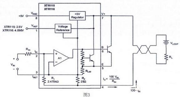 把傳感器輸出的不同電壓轉(zhuǎn)換成標(biāo)準(zhǔn)的4-20ma輸出,可采用不同的電路形式。成本低的可采用分立器件,但是為了達(dá)到比較高的精度,要保證相應(yīng)器件的匹配程度,調(diào)試也比較麻煩。傳感器專(zhuān)用的4-20ma 的一體化變送器集成電路,采用該系列產(chǎn)品設(shè)計(jì)的變送器成本低,精度高,調(diào)試簡(jiǎn)單。經(jīng)過(guò)選擇決定使用完成設(shè)計(jì)。內(nèi)部結(jié)構(gòu)如圖三: