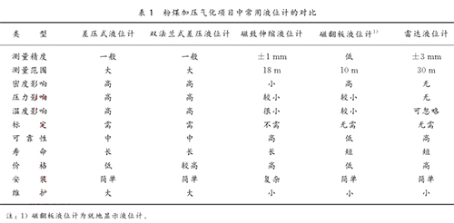 目前在粉煤加壓氣化項(xiàng)目中常采用的液位計(jì)類型主要有:差壓式液位計(jì)、雙法蘭式差壓液位計(jì)、磁致伸縮液位計(jì)、磁翻板液位計(jì)、雷達(dá)液位計(jì)等。這幾種液位計(jì)各有特色,都存在著一定的優(yōu)勢與不足,性能對(duì)比結(jié)果見表1所列。