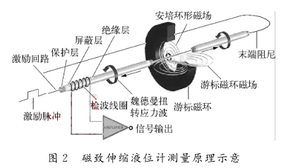 這樣的選型設(shè)計(jì),雖然能夠滿足測量準(zhǔn)確度的要求,但相應(yīng)增加了購置成本,并且根據(jù)項(xiàng)目應(yīng)用的實(shí)際反饋,現(xiàn)場存在泄漏點(diǎn)多、安裝與維護(hù)較復(fù)雜等問題。因此在新的伊泰杭錦旗項(xiàng)目中,由于項(xiàng)目所在地的晝夜溫差較大,冬季環(huán)境溫度*低,改用側(cè)裝3臺(tái)磁致伸縮式液位計(jì)并配磁翻柱顯示器來替代原先的差壓式測量方案。磁致伸縮式液位計(jì)主要依據(jù)磁致伸縮原理而工作,工作原理如圖2所示,由傳感器電路沿磁致伸縮線(波導(dǎo)絲)發(fā)出電流脈沖,在磁致伸縮線周圍形成環(huán)形磁場,當(dāng)其與浮子內(nèi)的永磁鐵產(chǎn)生的縱向磁場發(fā)生疊加時(shí),會(huì)在浮子位置產(chǎn)生1個(gè)扭轉(zhuǎn)脈沖回傳至傳感器的探頭。測量起始脈沖與返回脈沖的時(shí)間差來確定浮子的位置,即液面的位置。磁致伸縮液位計(jì)具有精度高、使用壽命長、無需調(diào)零校準(zhǔn)、易維護(hù)、安全性高等優(yōu)點(diǎn),但是在安裝時(shí)要注意:探測桿要保證垂直,不能折彎;做好接地屏蔽工作,以免電磁干擾影響測量效果。