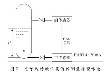 c)對(duì)膜片的材質(zhì)要求較高。為防止腐蝕與氫脆現(xiàn)象,需要選用316L鍍金膜片,成本較高。同時(shí)由于介質(zhì)的易沉積性,在加裝沖洗吹掃裝置后,仍然需要定期清理更換膜片,以保證測量精度。2)改進(jìn)的電子遠(yuǎn)傳液位變送器。在后續(xù)的項(xiàng)目中采用改進(jìn)的電子遠(yuǎn)傳液位變送器,其測量原理如圖3所示。該種電子遠(yuǎn)傳液位變送器取消了傳統(tǒng)的毛細(xì)管引壓方式,使用主、副2個(gè)壓力傳感器,分別安裝于容器的底部與上方,用來測量高低壓側(cè)的壓力。2個(gè)壓力傳感器以CAN總線的方式連接到一起,并且將副傳感器接收到的壓力信號(hào)傳至主傳感器中進(jìn)行差壓計(jì)算,計(jì)算完成后轉(zhuǎn)換成標(biāo)準(zhǔn)的4~20mA信號(hào)輸出。
