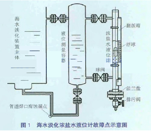 2013年12月16日0:20海淡水化裝置主體U3濃鹽水液位計開始出現(xiàn)30%~70%的波動,檢查液位計本體無異常,將液位計上、下閥門關(guān)小后,液位測量波動減小,但故障現(xiàn)象并未消失。利用高爐休風(fēng)機(jī)會降海水淡化U3主體負(fù)荷并查找故障原因。將液位計上、下閥門全關(guān)閉并拆下下部絲堵,打開排污閥徹底進(jìn)行排氣排污處理,檢測磁性浮子,未發(fā)現(xiàn)異常。當(dāng)投運后波動現(xiàn)象存在。濃鹽水液位計更換后再次試投運,發(fā)現(xiàn)液位計液位顯示波動更大、更頻繁。經(jīng)過排查發(fā)現(xiàn)與液位測量容器(見圖1)連接的管道焊接處有漏點,對該漏點進(jìn)行封堵后液位測量顯示恢復(fù)穩(wěn)定,負(fù)荷狀態(tài)生產(chǎn)恢復(fù)正常。